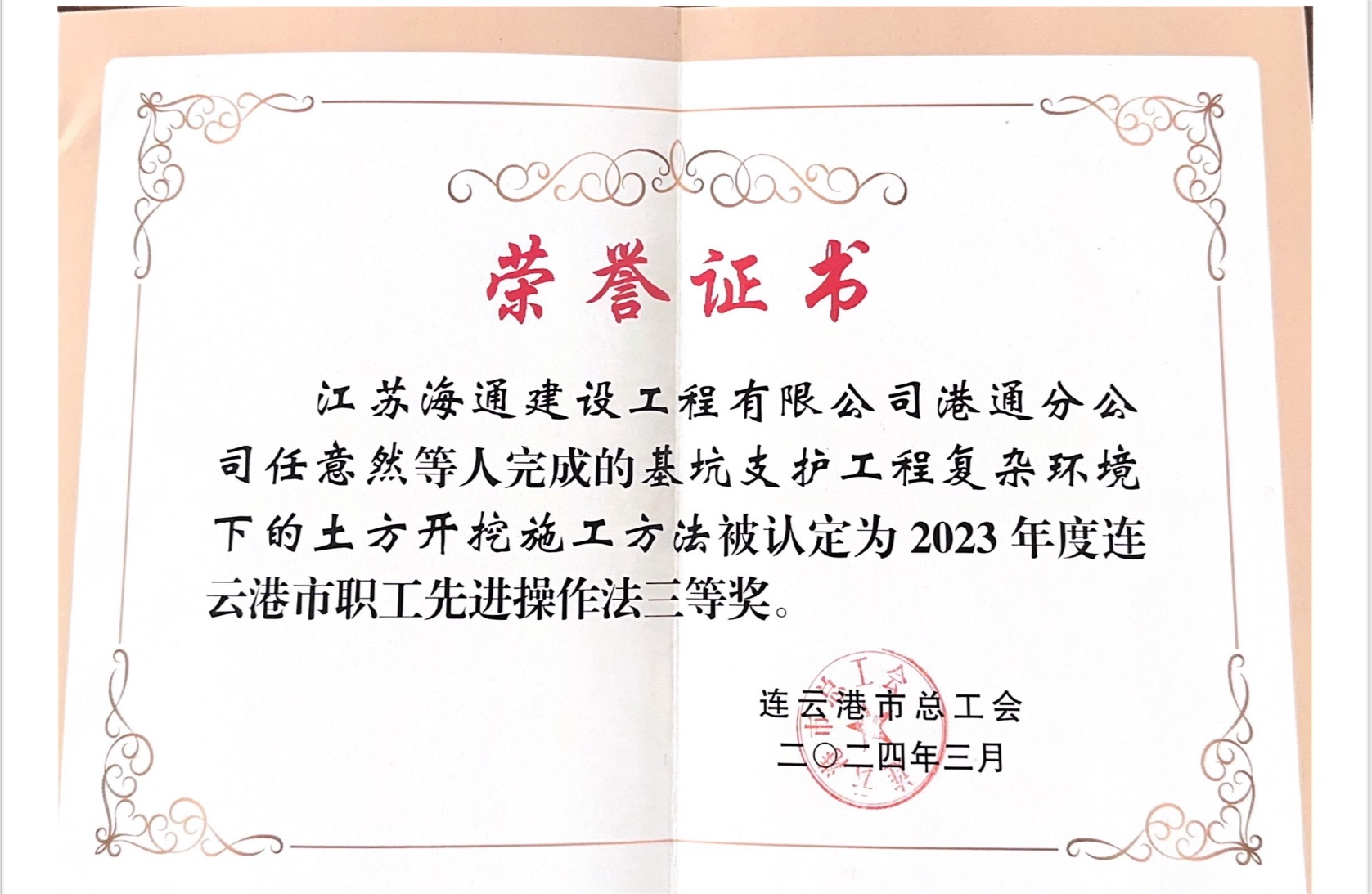 近日,從連云港市總工會傳來喜訊,江蘇海建公司申報的《基坑支護工程復雜環(huán)境下的土方開挖施工方法》獲得2023年度職工先進操作法三等獎。