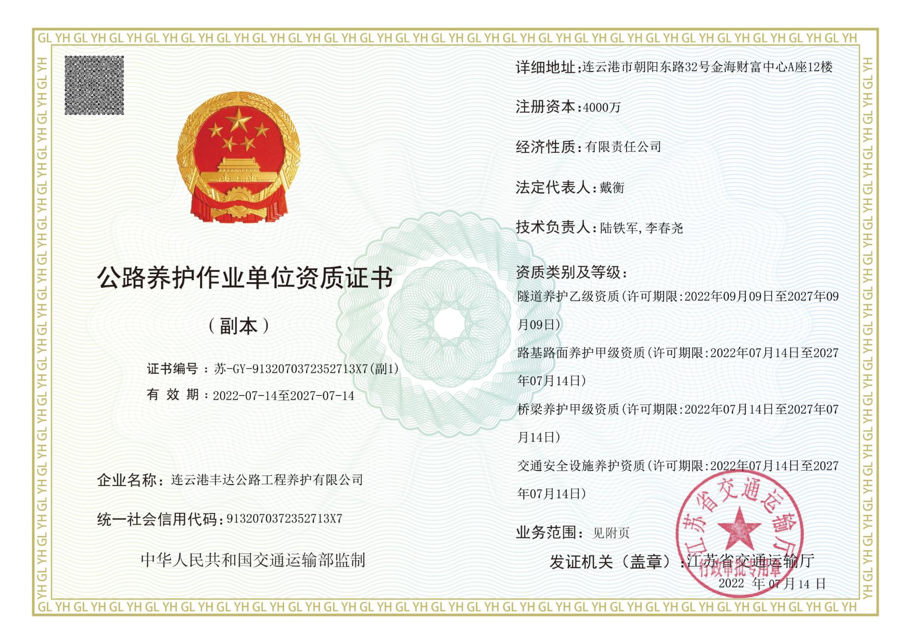 目前,豐達公司已獲得隧道乙級、路基路面養(yǎng)護甲級、橋梁養(yǎng)護甲級、交安設(shè)施養(yǎng)護四項資質(zhì),實現(xiàn)了養(yǎng)護業(yè)務(wù)范圍的不斷拓展和延伸。下一步公司將持續(xù)發(fā)力,不斷優(yōu)化資質(zhì)體系,提高養(yǎng)護作業(yè)能力和水平,為企業(yè)長遠發(fā)展打下堅實基礎(chǔ)。