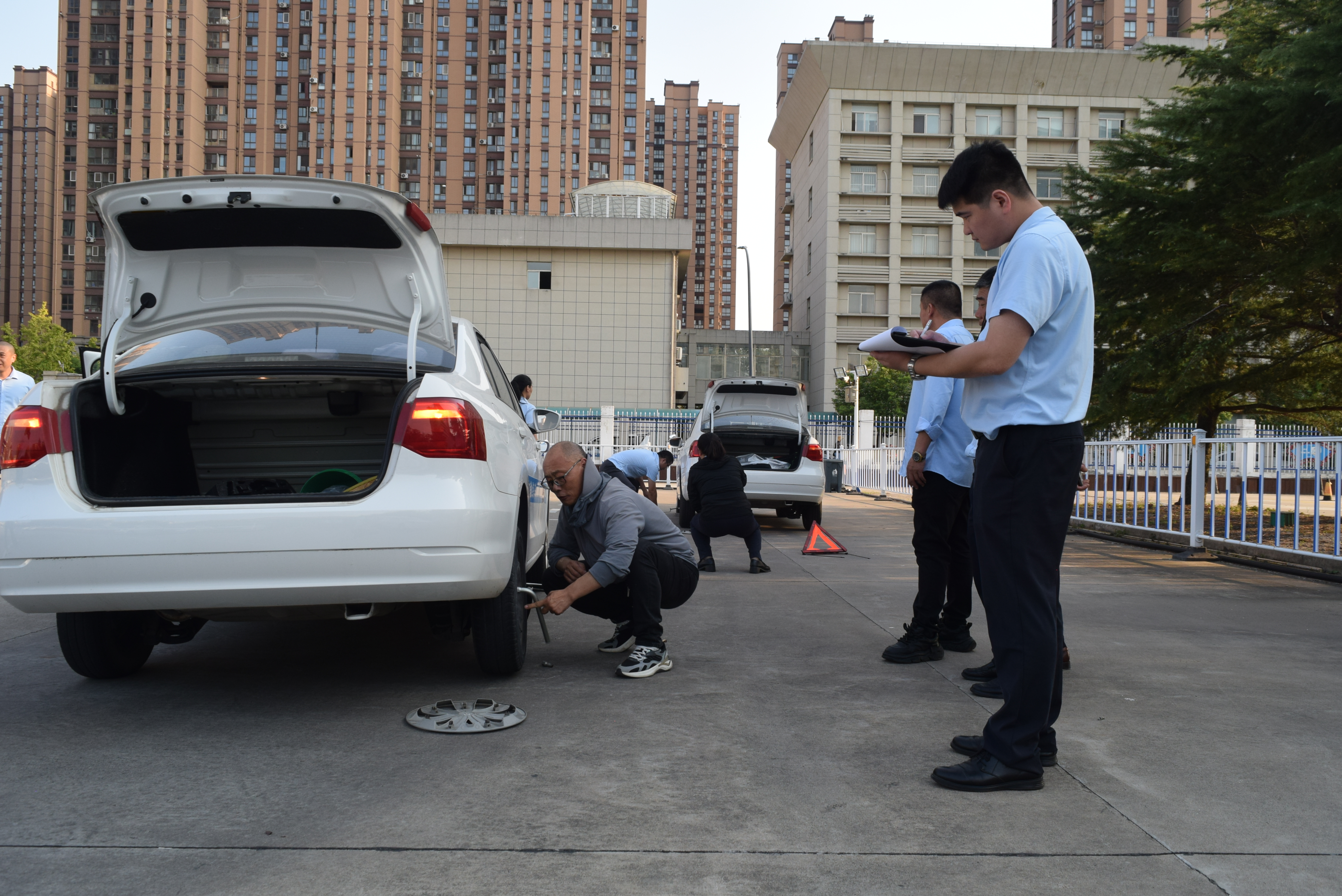 比賽中,選手們熟練地取出千斤頂、套筒等車輛輪胎拆裝工具進(jìn)行輪胎更換作業(yè),拉起手剎、打開危險報警閃光燈、擺放三角警示牌、卸裝輪胎等一系列操作一氣呵成。比賽現(xiàn)場看似平靜,但其實(shí)大家都在暗暗較勁兒,氣氛異常激烈。經(jīng)過兩個小時緊張又激烈的角逐,最終3名教練員脫穎而出,取得了前三名的好成績。