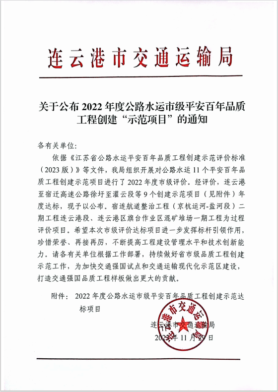 402省道贛榆南環(huán)段路基橋涵工程S402GYNH~SG2標段工程項目順利通過2022年度公路水運市級平安百年品質(zhì)工程“示范項目”。