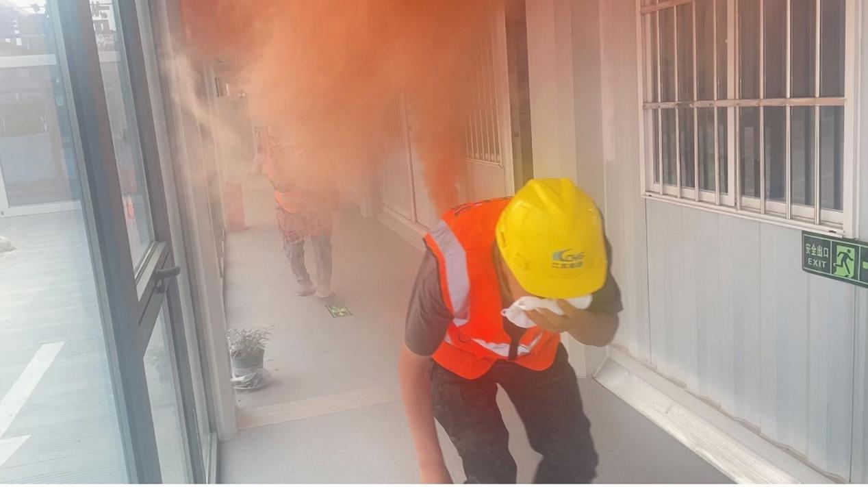 本次演練模擬項目部辦公區(qū)域意外著火的場景。演練現(xiàn)場,濃煙逐漸升起,火勢有迅速蔓延的趨勢。險情出現(xiàn)后,項目負責(zé)人第一時間拉響警報,應(yīng)急救援小組按照預(yù)案分工進行救援,電工馬上切斷電源;搶險組趕赴火災(zāi)現(xiàn)場,使用消防水帶連接就近的消防栓控制火勢;警戒疏散組拉設(shè)警示帶設(shè)置警示區(qū),指揮現(xiàn)場人員疏散到安全區(qū)并清點人數(shù),禁止無關(guān)人員進入火災(zāi)現(xiàn)場,維持現(xiàn)場的秩序,避免造成混亂。