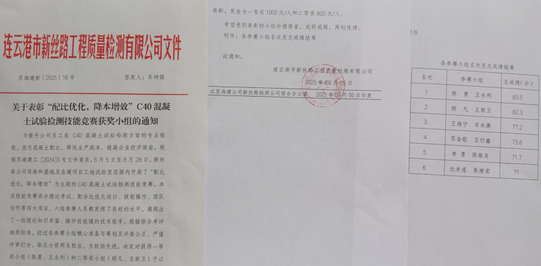 比賽伊始,公司技術(shù)部門制定詳細(xì)的競賽規(guī)則和評分標(biāo)準(zhǔn),以確保比賽的公平性和專業(yè)性。參賽團(tuán)隊(duì)需根據(jù)給定的原材料,在滿足C40混凝土強(qiáng)度和工作性能要求的前提下,設(shè)計(jì)出最優(yōu)的配合比方案,并進(jìn)行實(shí)際生產(chǎn)驗(yàn)證。比賽過程中,各團(tuán)隊(duì)充分發(fā)揮專業(yè)知識和創(chuàng)新思維,大膽調(diào)整水泥、骨料、外加劑等原材料的比例,力求在保證混凝土質(zhì)量的同時(shí),最大限度地降低成本。在競賽過程中,各參賽團(tuán)隊(duì)展現(xiàn)出較高的專業(yè)水平和創(chuàng)新能力。經(jīng)過多個(gè)環(huán)節(jié)的激烈比拼,陳勇/王永利、顧凡/王新衛(wèi)分獲了一、二等獎(jiǎng)。