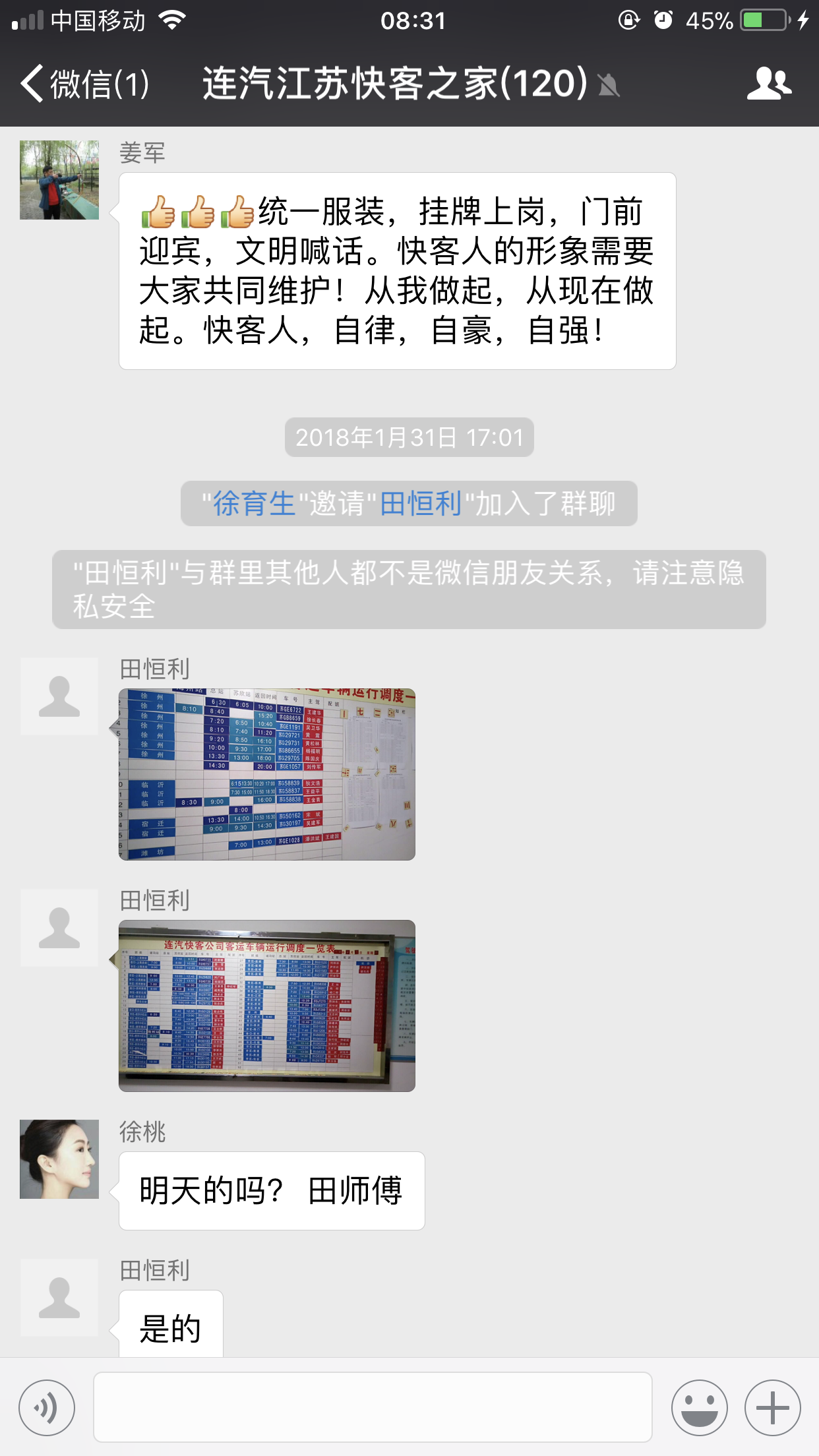 這是快客公司的員工微信群,每天各個科室會及時將春運工作提示發(fā)布到微信群,并快速回答員工的詢問;發(fā)現(xiàn)各種的不良苗頭,第一時間發(fā)布出來,給大家提個醒;堅持每天推出第二天的調(diào)度安排,讓駕駛員提前知道明天的行車計劃,將每個的閃光點通過照片展示出來,給堅守一線的駕駛員打氣鼓勁,這是連汽快客公司運用微信群在春運期間的安全神器。