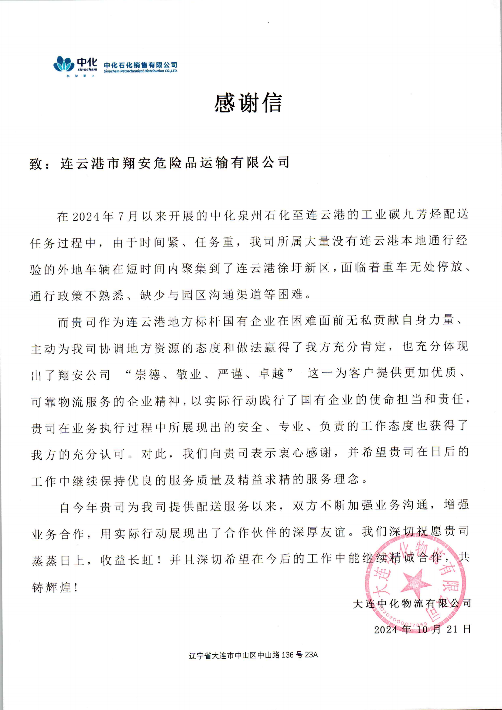 10月28日,連汽翔安危險(xiǎn)品運(yùn)輸有限公司收到了大連中化物流有限公司的一封感謝信。信中對翔安公司為大連中化物流有限公司在連云港業(yè)務(wù)的順利開展所提供的支持和服務(wù)表示了由衷的贊賞和感謝。
