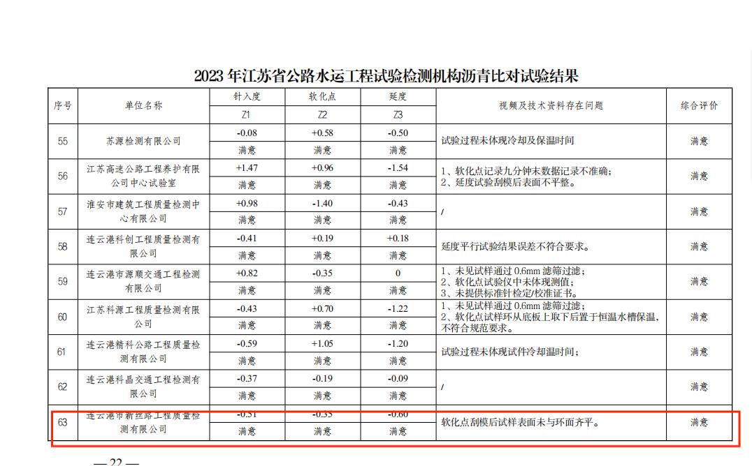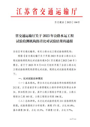日前,江蘇省交通運(yùn)輸廳組織開展了全省公路水運(yùn)工程試驗檢測機(jī)構(gòu)瀝青比對試驗,江蘇海建新絲路檢測公司高度重視,認(rèn)真參與。近日,根據(jù)蘇交建函〔2023〕104號發(fā)文通報,公司在此次比對試驗中結(jié)果為“滿意”。