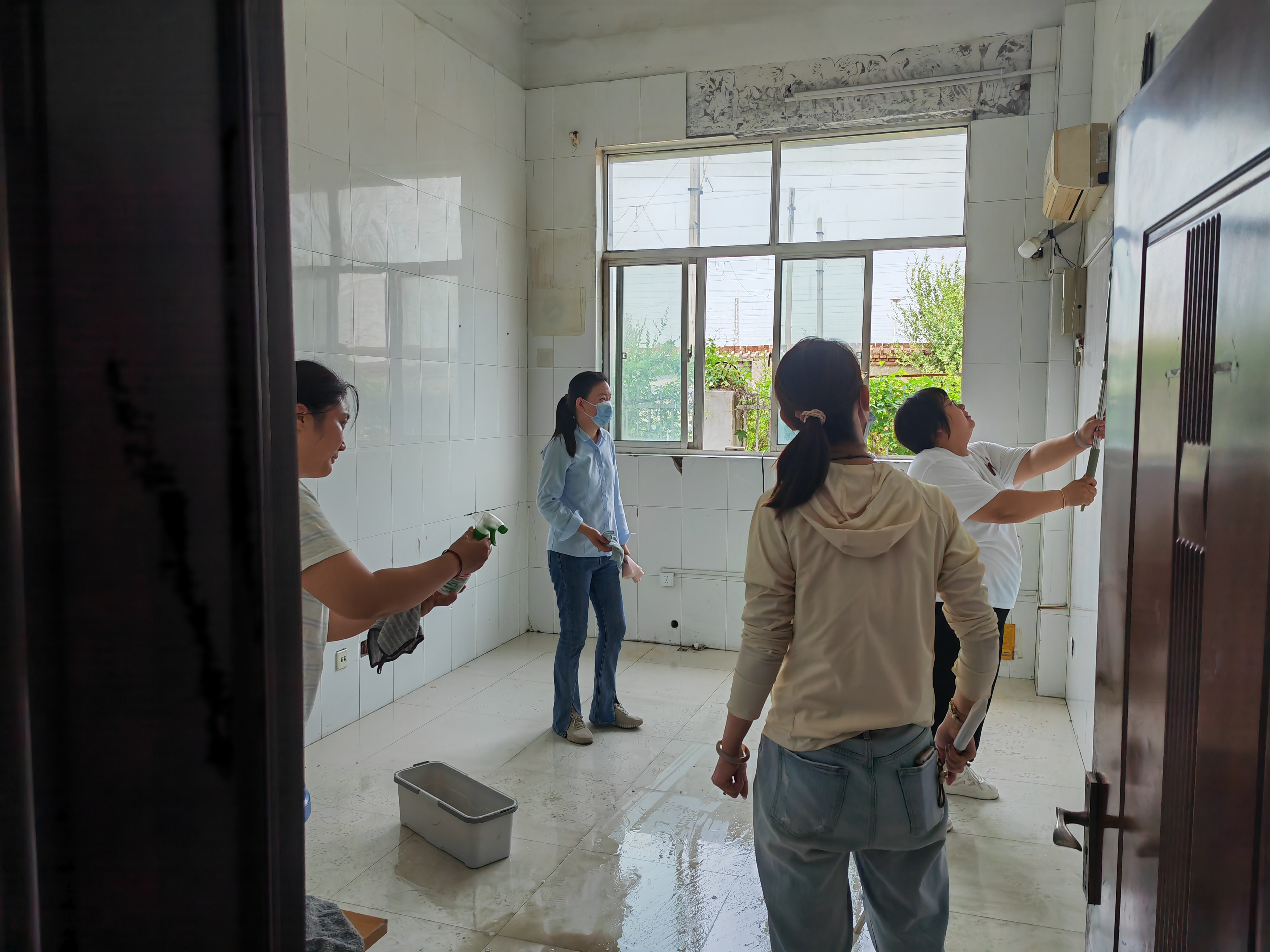 清理現(xiàn)場,大家干勁十足。管理人員們不放過任何一個衛(wèi)生死角,首先將堆積的廢棄物品徹底清空。隨后,按照“先掃后拖”的流程,對地面進行深度清潔。床頭、床架縫隙這些容易積灰的角落,墻面瓷磚的每一處細節(jié),都被一一擦拭干凈。面對頑固污漬,大家更是拿出“繡花”功夫,使用洗潔精、“手榴彈”等專業(yè)清潔劑仔細處理。時值酷暑,室內(nèi)溫度高達30多度,汗水很快浸透了每個人的衣衫,豆大的汗珠順著臉頰不斷滑落……但沒有人叫苦叫累,大家心中只有一個目標:為駕駛員兄弟們創(chuàng)造一個更舒適的家。
