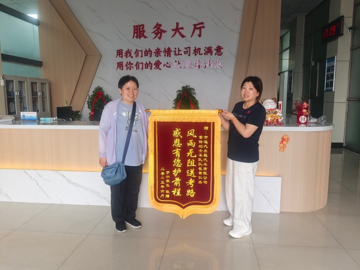 家住海州區(qū)華聯(lián)附近的市民徐女士,更是特意制作了一面寫有“風雨無阻送考路,感恩有您護前程”的錦旗,親自送到汽服公司出租汽車事業(yè)部,以此表達對“雷鋒的士”車隊隊長黃仁杰師傅的深深謝意。徐女士回憶道,她是通過蒼梧晚報看到了愛心送考服務的廣告,抱著試試看的心態(tài)為二兒子小于報名了一對一點對點送考服務。沒想到,對接的黃仁杰師傅讓她十分感動。黃師傅提前兩天就與她仔細對接送考路線,反復確認每一個細節(jié),確保萬無一失。送考的三天里,黃師傅每次都提前到達約定地點,車內(nèi)干凈整潔,一塵不染。高考期間天氣炎熱,黃師傅不僅準時出現(xiàn)在考場外,還貼心地為考生準備了礦泉水,讓徐女士一家感激不已。