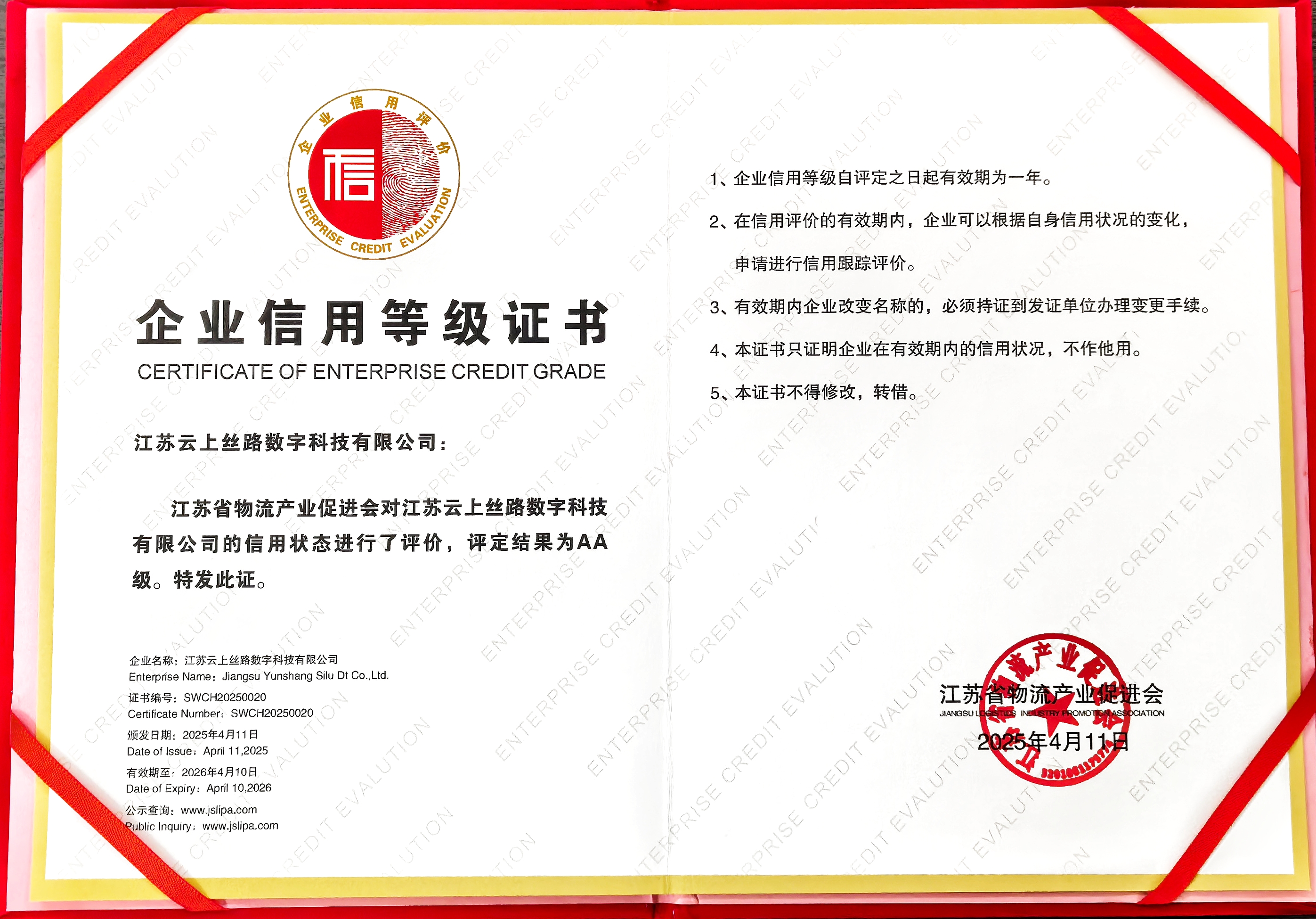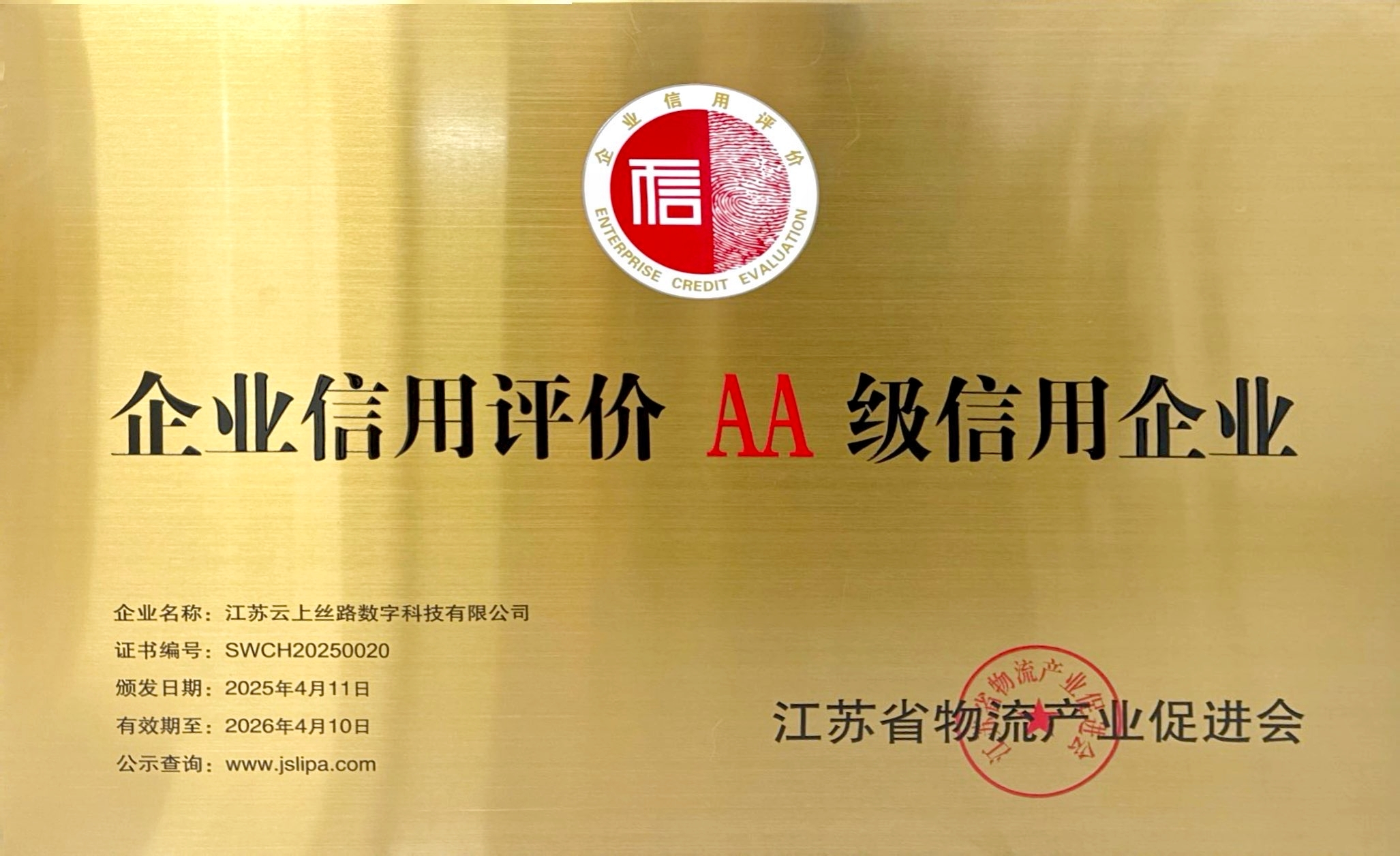 江蘇云上絲路數(shù)字科技有限公司榮獲物流企業(yè)信用評價AA級信用企業(yè)稱號