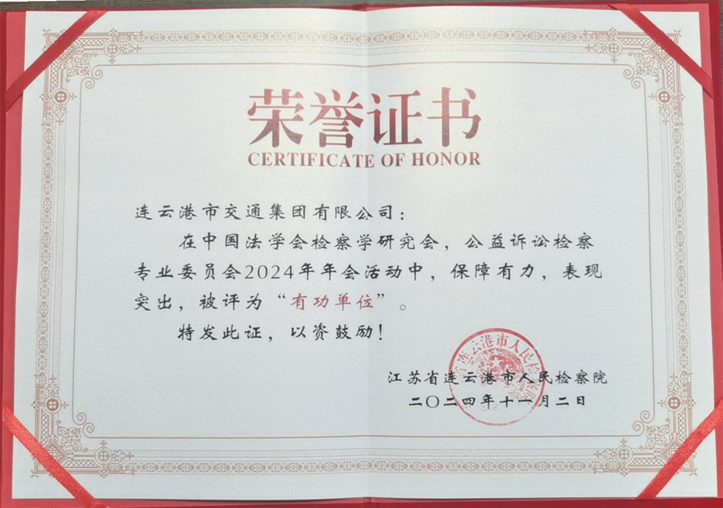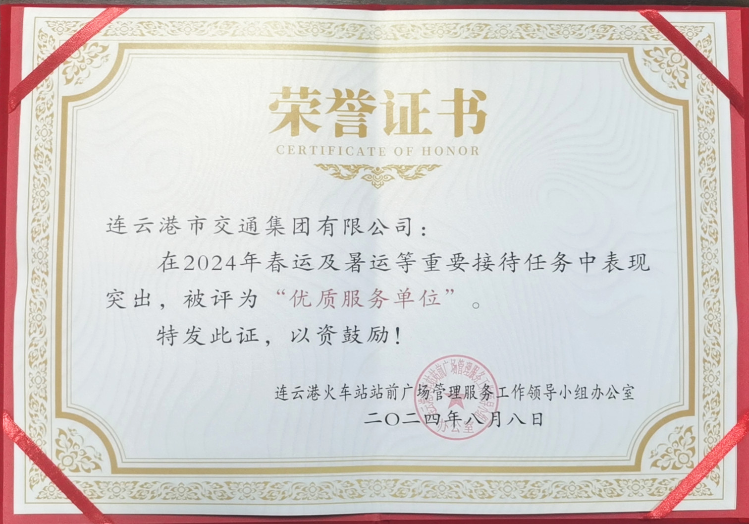 交通集團憑借卓越的服務(wù)質(zhì)量和高度的社會責(zé)任感,榮獲了由市人民檢察院、市公安局公共交通分局、連云港火車站站前廣場管理服務(wù)工作領(lǐng)導(dǎo)小組辦公室頒發(fā)的榮譽證書,以及市發(fā)展和改革委員會贈送的錦旗。