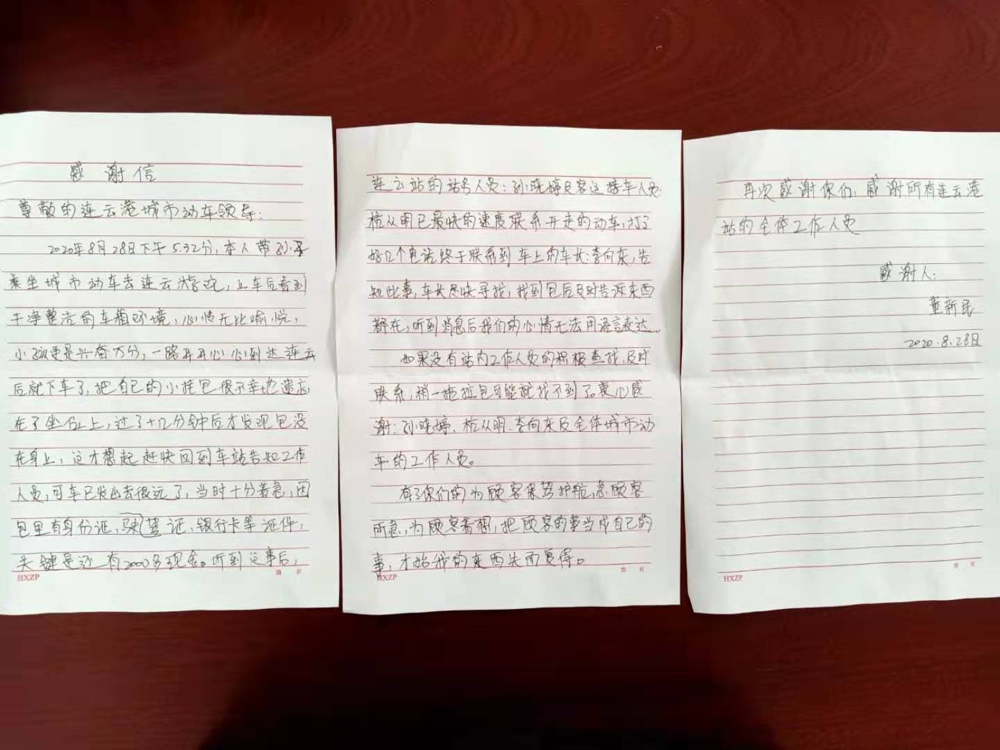 8月28日下午,一位大爺帶著孫子乘坐城市動車去連云景區(qū)游玩。新穎獨(dú)特、舒適整潔的車廂一下吸引了小朋友的注意力,小朋友興奮萬分,大爺也感嘆城市的發(fā)展速度并由衷的高興,以至于到達(dá)連云站下車時,把小掛包丟在了車上。過了十幾分鐘后,才發(fā)現(xiàn)包沒在身上,大爺立馬趕回車站向工作人員尋求幫助??墒钱?dāng)時車已經(jīng)發(fā)車走了,大爺十分著急,因?yàn)榘镉猩矸葑C、駕駛證、銀行卡等重要證件,還有2000多元現(xiàn)金。得知情況后,連云站值班站長孫曉婷及客運(yùn)接車人員杭從明緊忙聯(lián)系當(dāng)班列車長李向東。得知此事后,列車長立馬尋找掛包,座椅的邊邊角角都找了一遍,果然在后排座位上找到了掛包。他立刻聯(lián)系站務(wù)員告知包已經(jīng)找到,聽到這個好消息后,大爺懸著的心終于落地了,高興地說“謝謝你們所有工作人員,如果不是你們的熱心幫助,我的包也不會在這么短的時間內(nèi)找到!”站務(wù)員及客運(yùn)接車員連忙回道:“這都是我們應(yīng)該做的,能幫助到您是我們最大的快樂?!?/span>