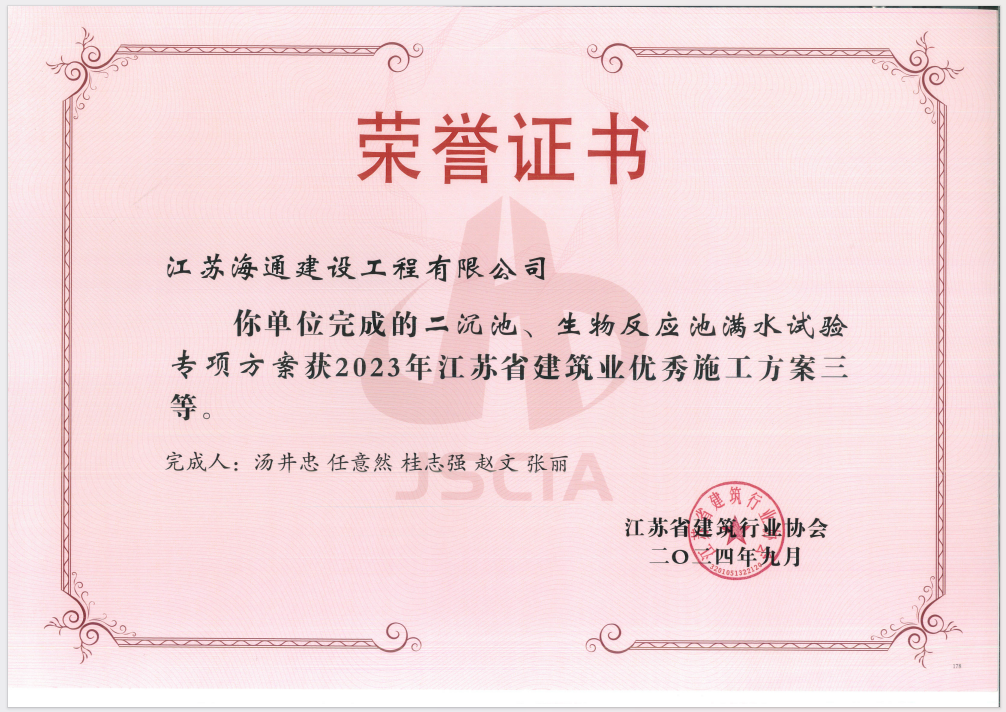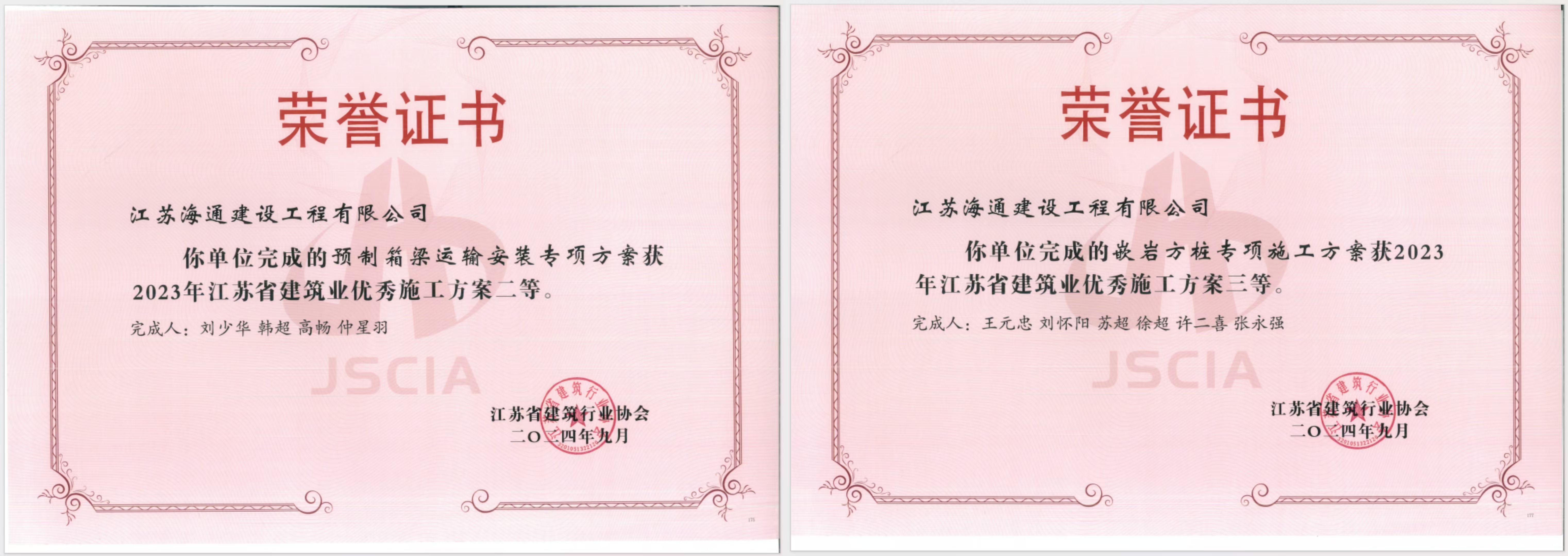 近日,江蘇省建筑行業(yè)協(xié)會(huì)公布了2023年度江蘇省建筑業(yè)優(yōu)秀施工方案評(píng)價(jià)結(jié)果,海建公司申報(bào)的三項(xiàng)施工方案獲得榮譽(yù),其中《預(yù)制箱梁運(yùn)輸安裝專項(xiàng)方案》獲得江蘇省建筑業(yè)優(yōu)秀施工方案二等,《嵌巖方樁專項(xiàng)施工方案》、《二沉池、生物反應(yīng)池滿水試驗(yàn)專項(xiàng)方案》獲得江蘇省建筑業(yè)優(yōu)秀施工方案三等。