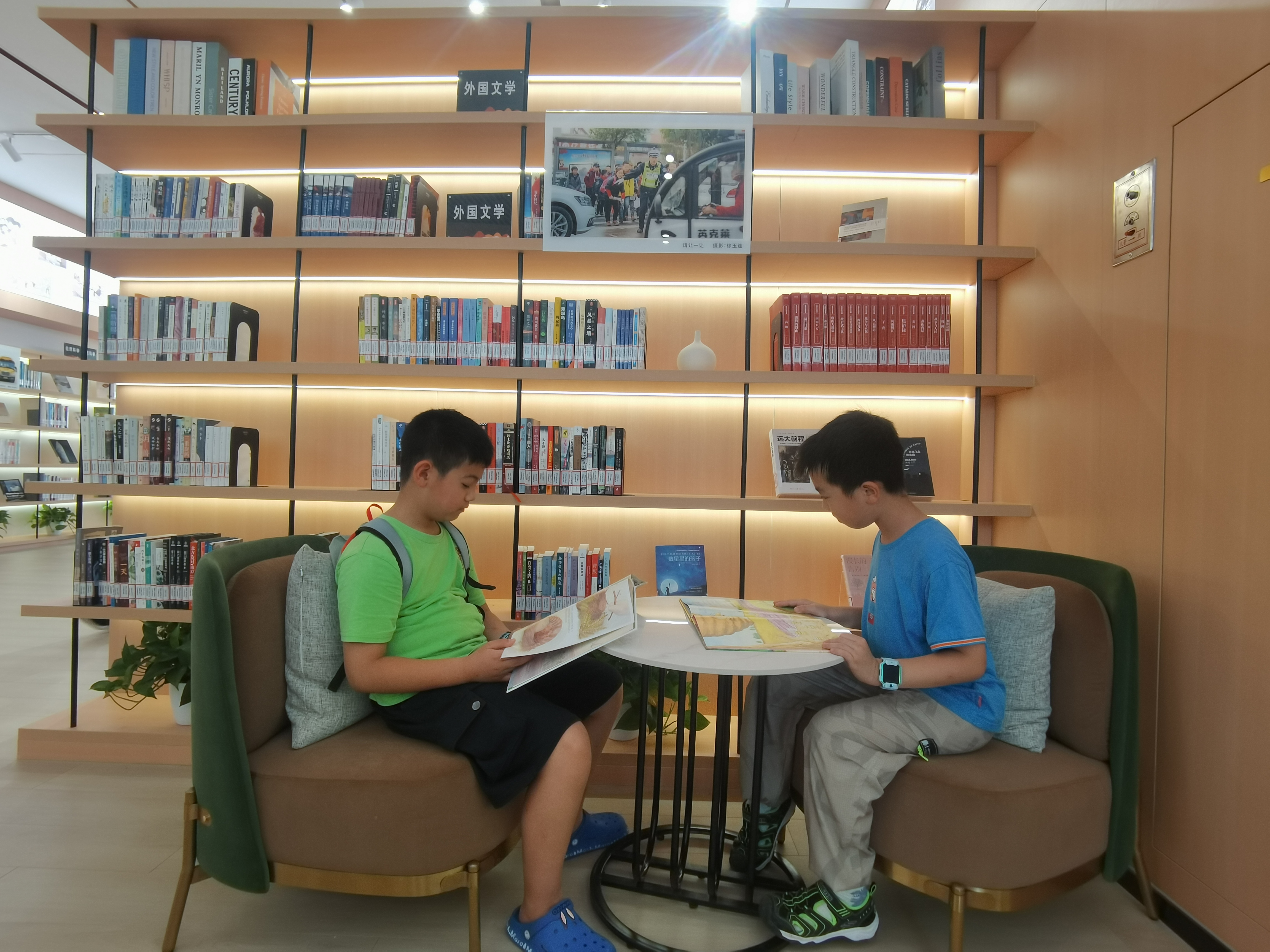 雷鋒車城市書房環(huán)境舒適,圖書豐富,放暑假后,幾乎天天座無虛席。孩子們坐在閱覽桌前認(rèn)真翻閱自己喜愛的圖書,遇到感興趣的內(nèi)容,還不忘和小伙伴一起分享、交流。