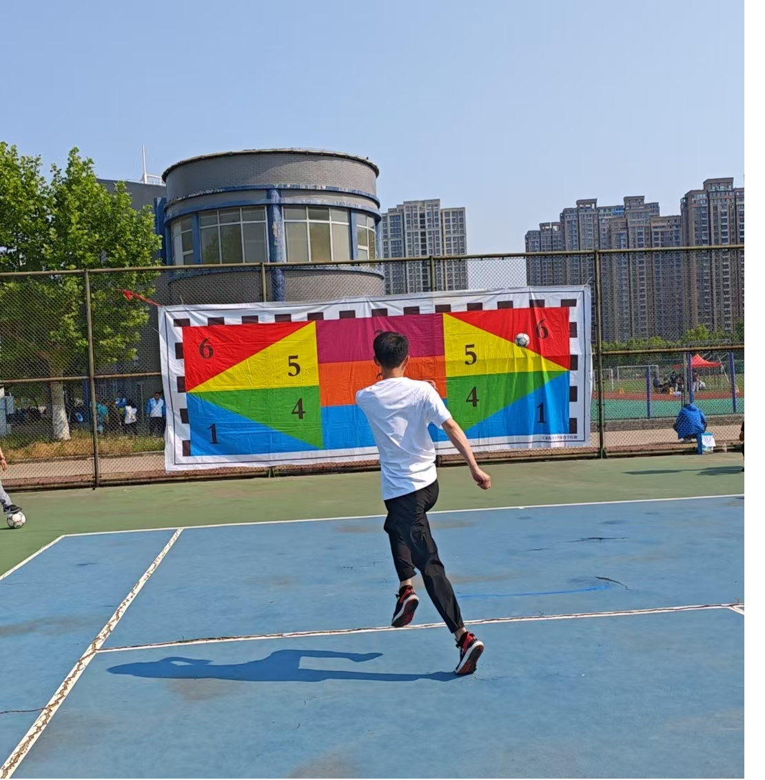 本次比賽采用“定點(diǎn)射門”賽制,塑膠籃排球場(chǎng)圍網(wǎng)上設(shè)足球墻,足球墻上根據(jù)進(jìn)球難度設(shè)定不同得分,參賽者在距離球門11 米(罰球點(diǎn))處進(jìn)行足球射門,每人射門六次,以累計(jì)得分定勝負(fù)。明茂公司李曉龍展現(xiàn)出超凡的控球能力與精準(zhǔn)度。他助跑、調(diào)整、起腳一氣呵成,足球如離弦之箭連續(xù)打中高分墻,贏得全場(chǎng)喝彩。