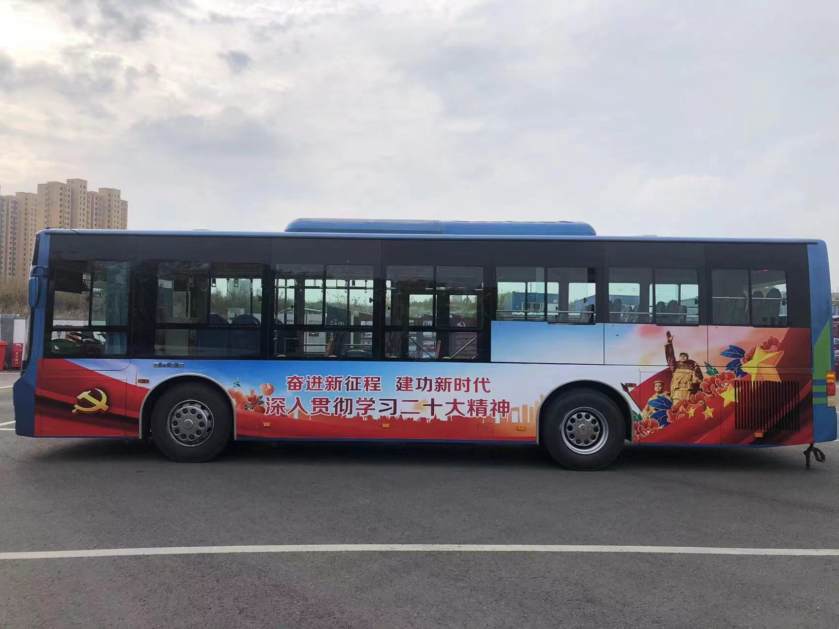 車身外觀,更新為以紅、藍(lán)色為主基調(diào),車身噴繪上“深入貫徹學(xué)習(xí)二十大精神”“奮進(jìn)新征程 建功新時代”等醒目的標(biāo)語,通過車輛每日運行的方式穿梭于城市的大街小巷,增強社會宣傳受眾面,讓黨的理論“坐”上公交,走向社會。