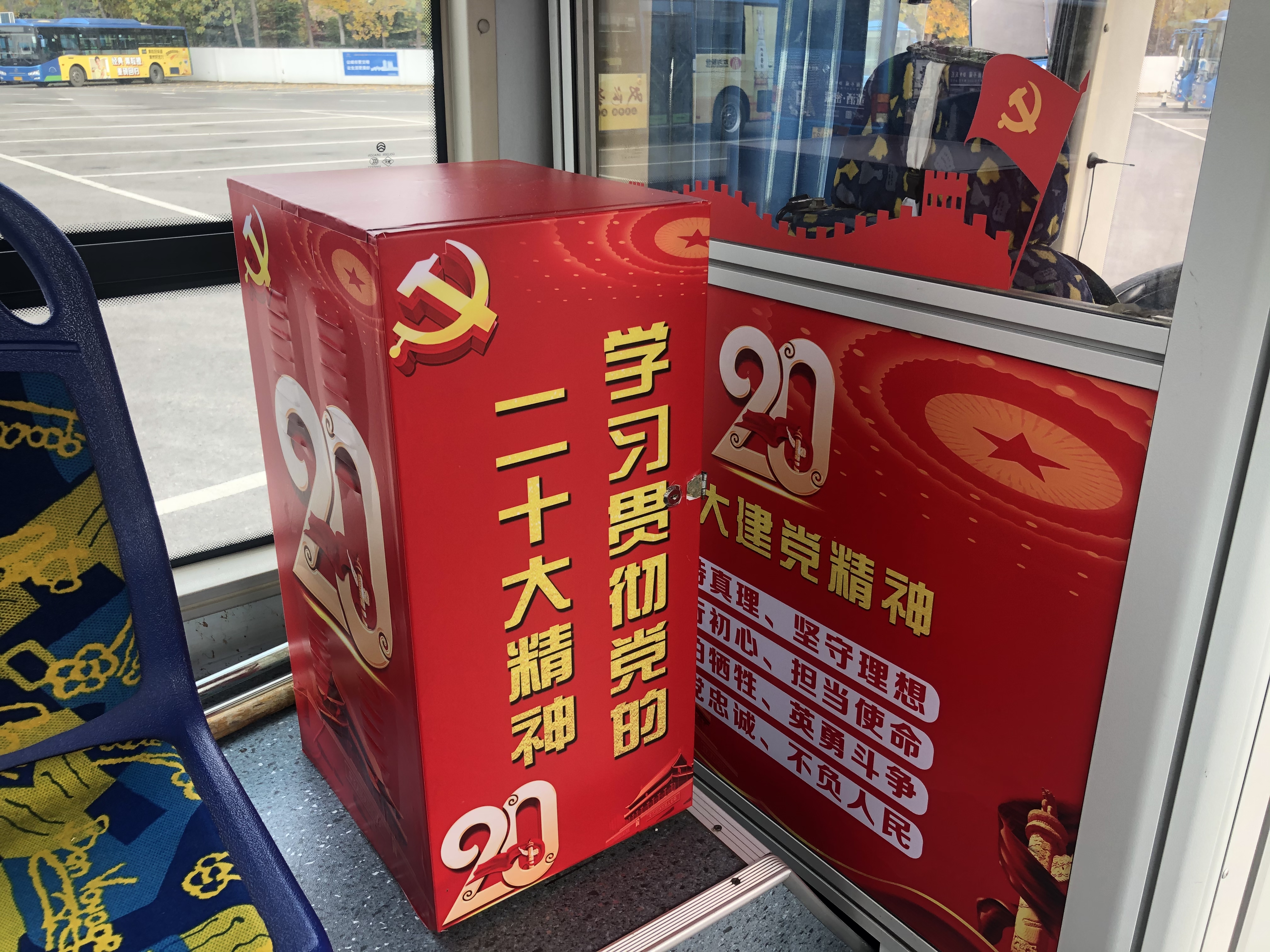 在暨2021年建黨百年“紅色黨史”主題車廂的基礎(chǔ)上,今年公交事業(yè)一部黨支部緊緊圍繞黨的二十大為宣傳主線,充分結(jié)合當(dāng)前工作實際,在持續(xù)深化黨史學(xué)習(xí)教育的同時,以公交20路為紅色宣傳載體再發(fā)力,分別將車身廣告及車內(nèi)展板進(jìn)行更新升級,以黨的二十大報告為主要宣傳內(nèi)容,打造了主題會議型車廂。