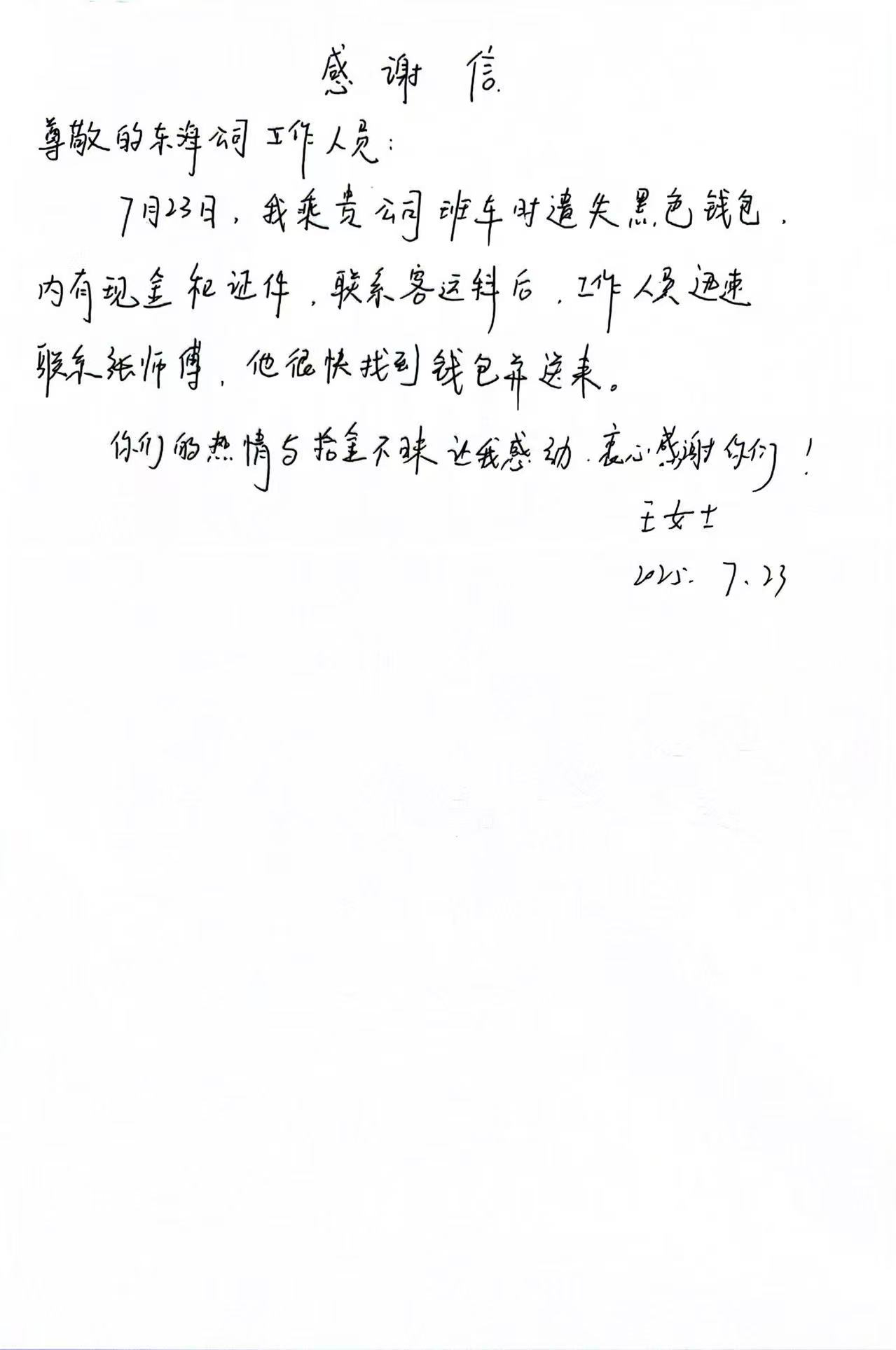 事后,王女士特意寫下感謝信,感慨錢包里面的現(xiàn)金、證件一樣沒少,再三感謝張師傅及工作人員。張師傅拾金不昧的行為,不僅展現(xiàn)了他個人高尚的道德品質(zhì),也彰顯了我公司員工良好的職業(yè)素養(yǎng),溫暖了乘客的心。
