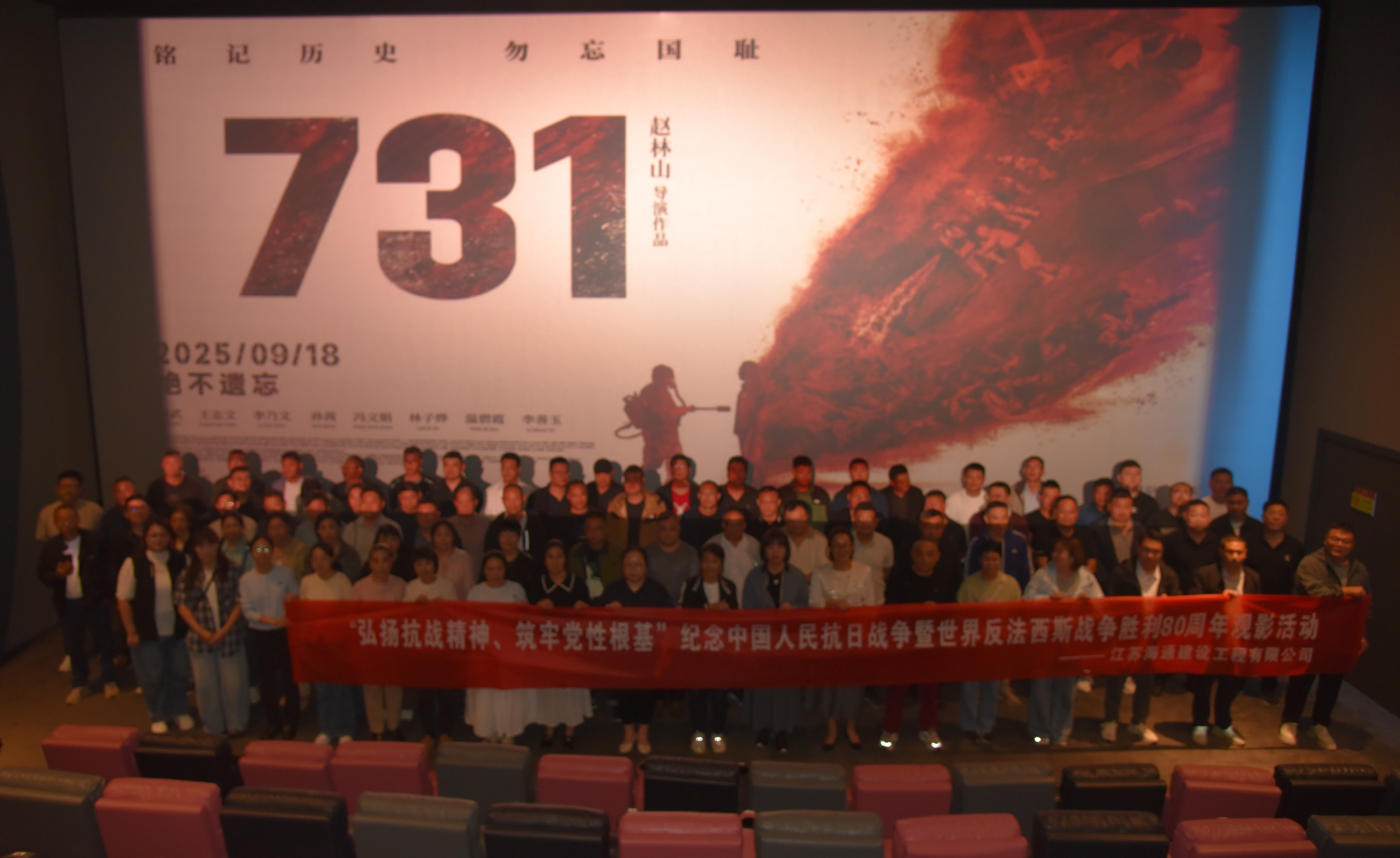 為深入學(xué)習(xí)貫徹習(xí)近平新時(shí)代中國特色社會主義思想,弘揚(yáng)偉大抗戰(zhàn)精神,激發(fā)黨員干部及群眾的愛國熱情與奮斗精神,近日,海建公司組織開展紀(jì)念中國人民抗日戰(zhàn)爭暨世界反法西斯戰(zhàn)爭勝利80周年觀影活動。110余名黨員、入黨積極分子及群眾代表共同觀看了歷史題材電影《731》,在光影中重溫歷史,筑牢黨性根基。