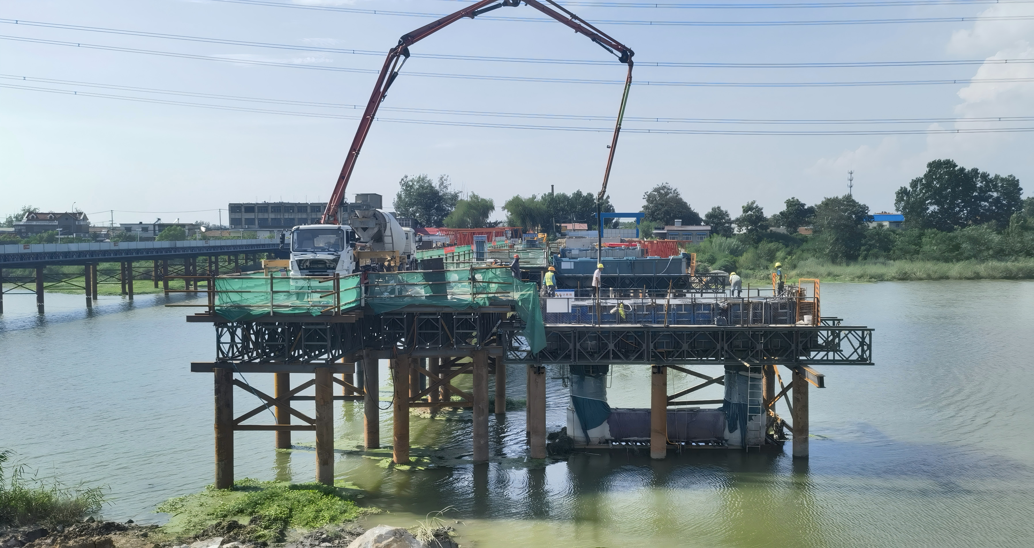 該五跨橋梁全長(zhǎng)210米,橫跨薔薇河,是作為薔薇河上的重要通道、老海州城區(qū)對(duì)外出行通道的重要交通樞紐。為確保水上蓋梁施工的安全與精度,項(xiàng)目部科學(xué)組織、精益管理,克服深水作業(yè)、汛期影響、通航壓力等多重挑戰(zhàn)。全體建設(shè)者發(fā)揚(yáng)連續(xù)作戰(zhàn)的精神,搶抓枯水期等有利時(shí)機(jī),晝夜輪班,最終安全、優(yōu)質(zhì)、高效地完成全部水上蓋梁的澆筑任務(wù),各項(xiàng)技術(shù)指標(biāo)均符合設(shè)計(jì)規(guī)范要求。現(xiàn)場(chǎng)項(xiàng)目負(fù)責(zé)人周宇寬表示:“水上蓋梁的全部完工,意味著大橋的‘水中骨架’已經(jīng)牢牢筑就。接下來,項(xiàng)目部將全力以赴轉(zhuǎn)入T梁架設(shè)及橋面系施工階段,我們有信心按期實(shí)現(xiàn)全橋合攏的目標(biāo)。”