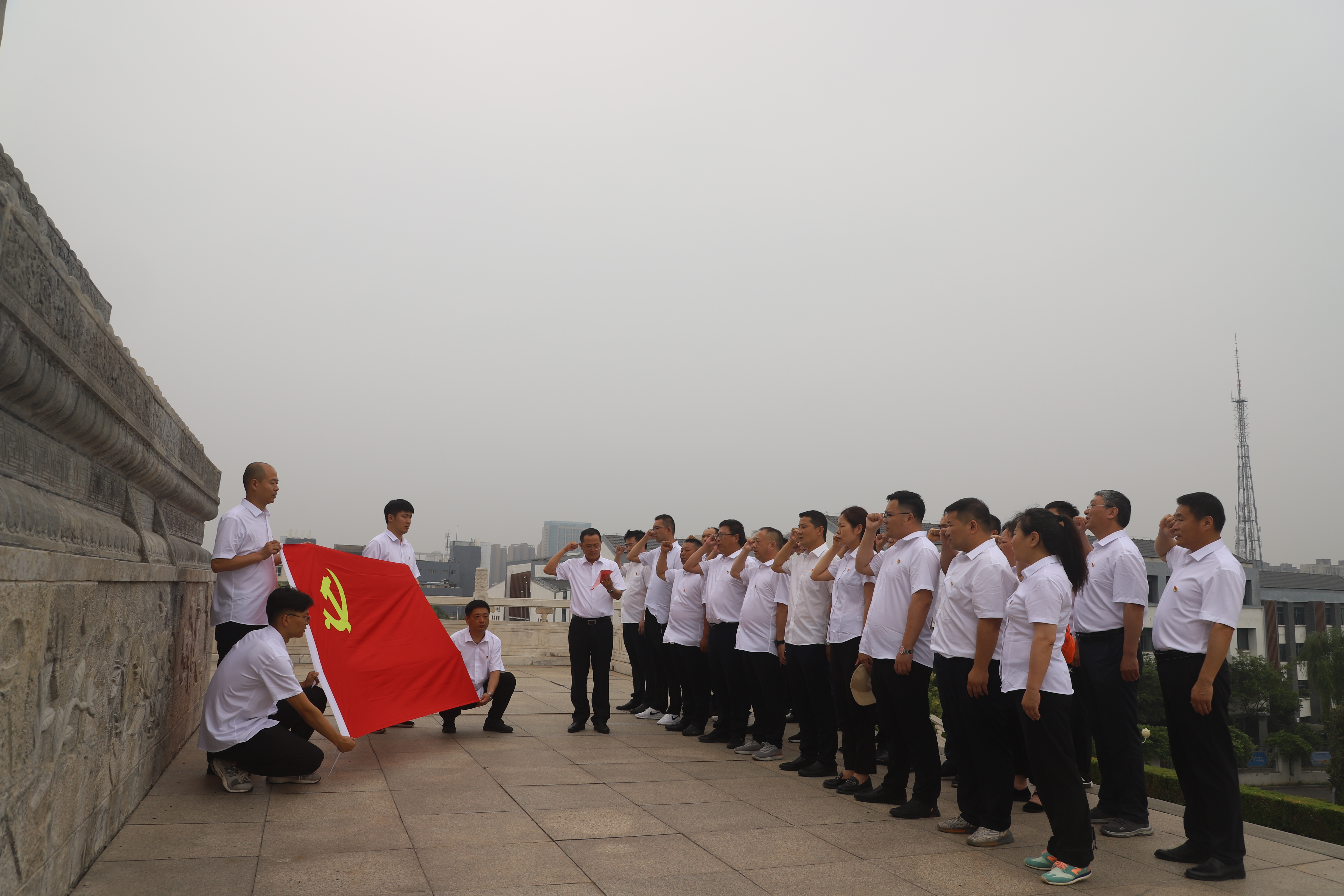 在宿北大戰(zhàn)紀(jì)念館內(nèi),觀看了宿遷地區(qū)革命斗爭史料,聆聽了講解員講解的戰(zhàn)斗英雄的故事,在一組組歷史照片和實(shí)物前大家凝神注目,回顧著陳毅等老一輩革命家運(yùn)籌帷幄、決勝千里的豪放氣質(zhì),感受著當(dāng)年激戰(zhàn)七天七夜的壯烈場景。隨后,前往宿北大戰(zhàn)馬陵山革命烈士紀(jì)念塔,在鮮艷的黨旗下,黨員們莊嚴(yán)宣誓,重溫了入黨誓詞。