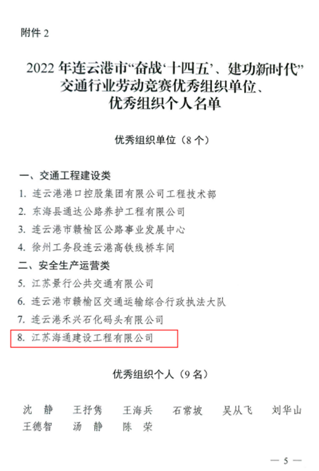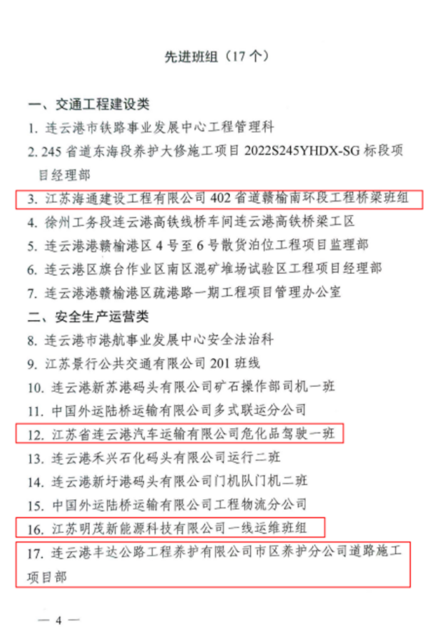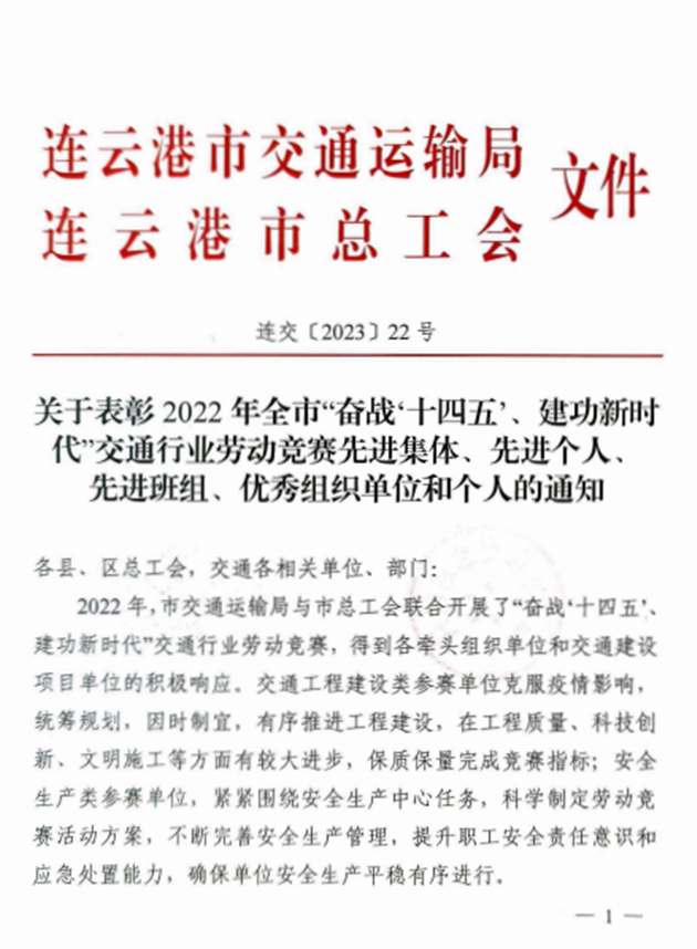 近日,從市總工會(huì)、市交通運(yùn)輸局傳來(lái)喜訊,集團(tuán)權(quán)屬公交集團(tuán)公交事業(yè)一部榮獲2022年全市“奮戰(zhàn)十四五、建功新時(shí)代”交通行業(yè)勞動(dòng)競(jìng)賽先進(jìn)集體,海建公司402省道贛榆南環(huán)段工程橋梁班組、汽車公司?;否{駛一班、明茂新能源公司一線運(yùn)維班組和豐達(dá)公司市區(qū)養(yǎng)護(hù)分公司道路施工項(xiàng)目部四個(gè)班組榮獲先進(jìn)班組,公交集團(tuán)周卓文被評(píng)為先進(jìn)個(gè)人,海建公司被評(píng)為優(yōu)秀組織單位。