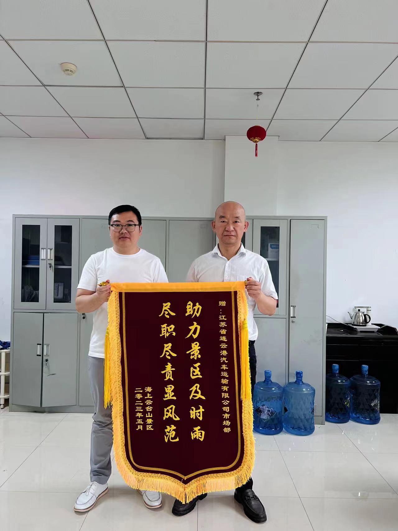 近日,海上云臺(tái)山景區(qū)工作人員來(lái)到汽車公司,送上了一面“助力景區(qū)及時(shí)雨 盡職盡責(zé)顯風(fēng)范”的錦旗,向在“五一”假期為景區(qū)游客群眾貼心服務(wù)、保駕護(hù)航的汽車公司駕駛員表示衷心感謝。