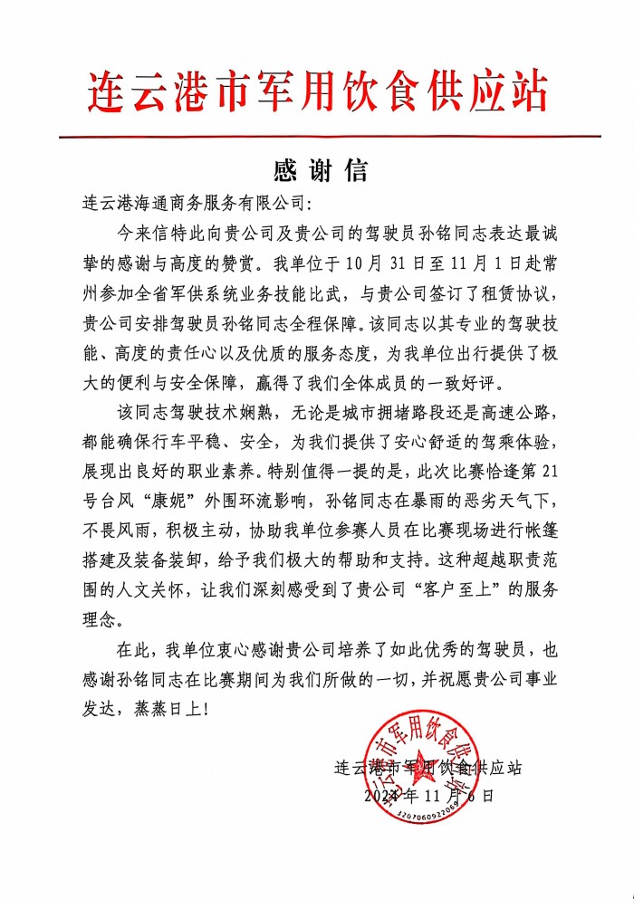 近日,汽服公司權(quán)屬汽車租賃事業(yè)部收到了一封來(lái)自連云港市軍用飲食供應(yīng)站的感謝信,信中表達(dá)了對(duì)租賃事業(yè)部政務(wù)保障車駕駛員孫銘的感謝與肯定。紙短情長(zhǎng),一封感謝信承載了客戶對(duì)駕駛員的信任與感激,也傳遞了汽服公司“客戶至上”的服務(wù)理念。