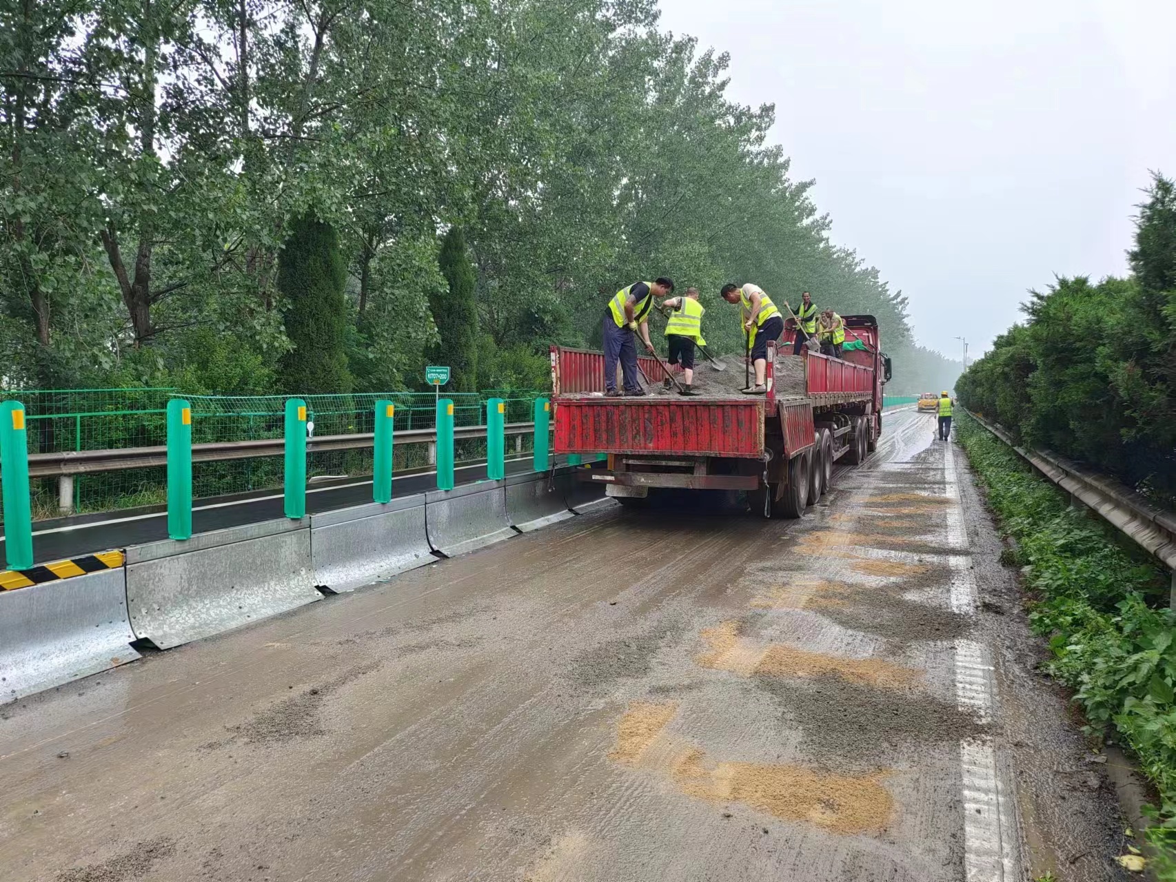 豐達公司寧連高速D標項目部接到上級電話通知,立即組織應急處置人員與車輛第一時間到達現(xiàn)場清理。項目部組織應急隊伍32人,工程車輛12輛趕赴現(xiàn)場,迅速開展現(xiàn)場清理、沙石吸附、清掃推灰。直至10:26分,經(jīng)施工人員多方努力,路面油污終于清理干凈,受污染路面消除了安全隱患,道路恢復了暢通。