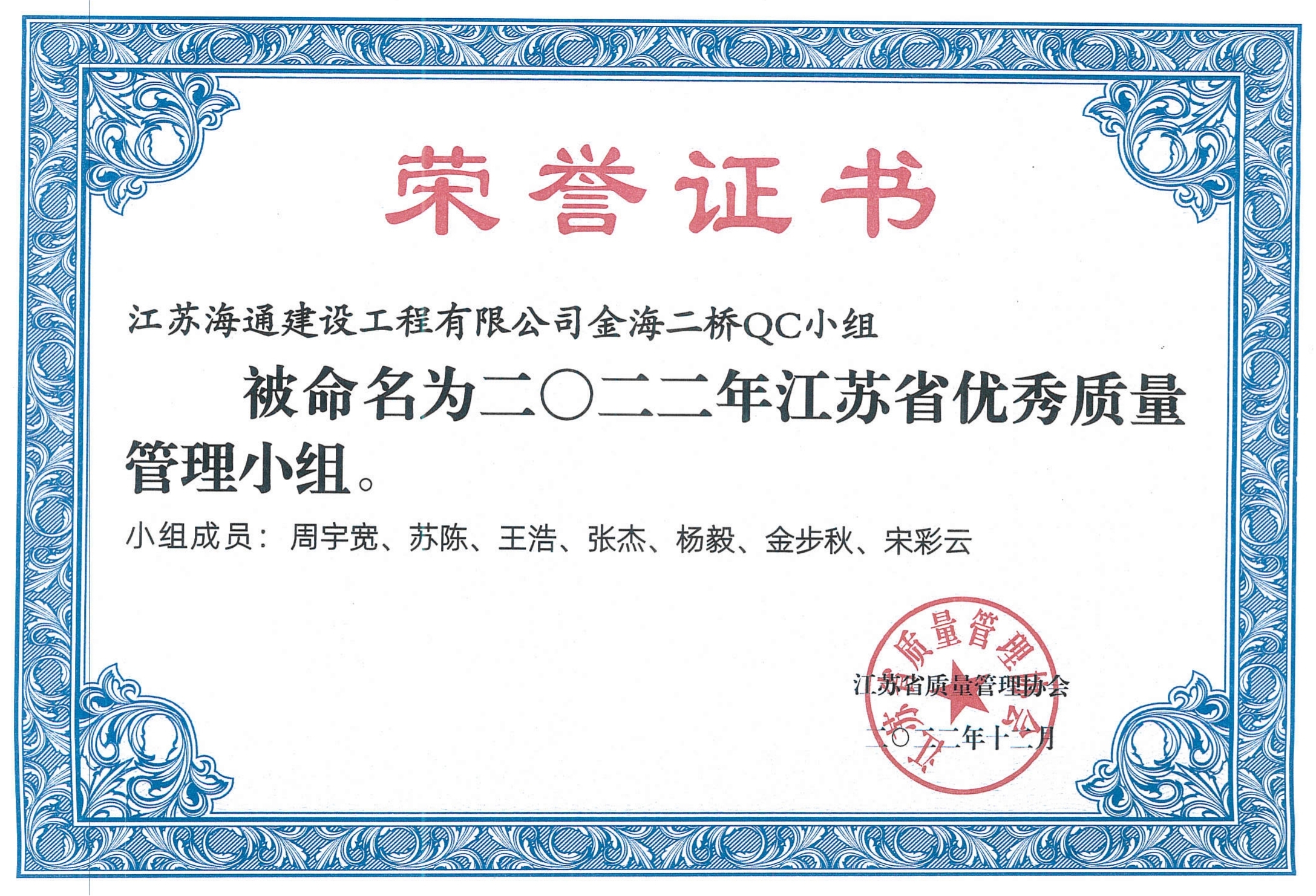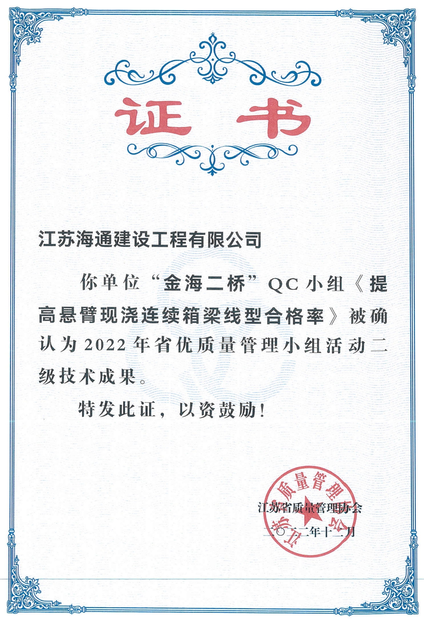 近日,從連云港市質(zhì)量協(xié)會(huì)獲悉,江蘇海建金海二橋QC小組成果《提高懸臂箱梁連續(xù)澆筑線型合格率》榮獲“2022年省優(yōu)質(zhì)量管理小組活動(dòng)二級(jí)技術(shù)成果”,同時(shí),金海二橋QC小組榮獲“2022年江蘇省優(yōu)秀質(zhì)量管理小組”。