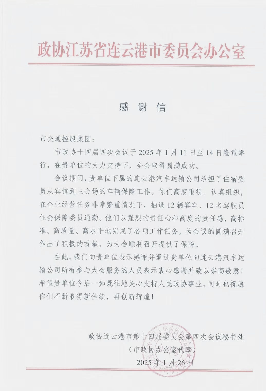 政協(xié)連云港市第十四屆委員會(huì)第四次會(huì)議秘書處在感謝信中,不僅向市交通控股集團(tuán)所屬的連云港汽車運(yùn)輸有限公司表達(dá)誠(chéng)摯謝意,還向所有參與服務(wù)的人員致以崇高敬意。